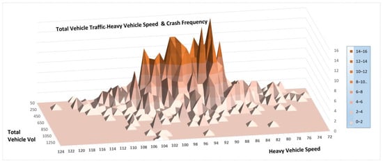 Considering the descriptive and inferential statistics, the presence of heavy vehicles is one of the main factors in the occurrence of crashes, and other identified parameters contribute to an accident. If the general flow of traffic between cities is considered, then the probability of crashes in both heavy and low traffic conditions is significantly different. Increasing the speed of heavy vehicles on average and the presence of light traffic increases the number of accidents per hour. According to Figure 3, when total vehicle volume is between 150 and 250 per hour and the average speed of the heavy vehicle is between 95 and 105 km/h, crash frequency surges dramatically.