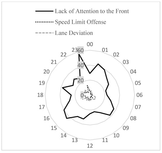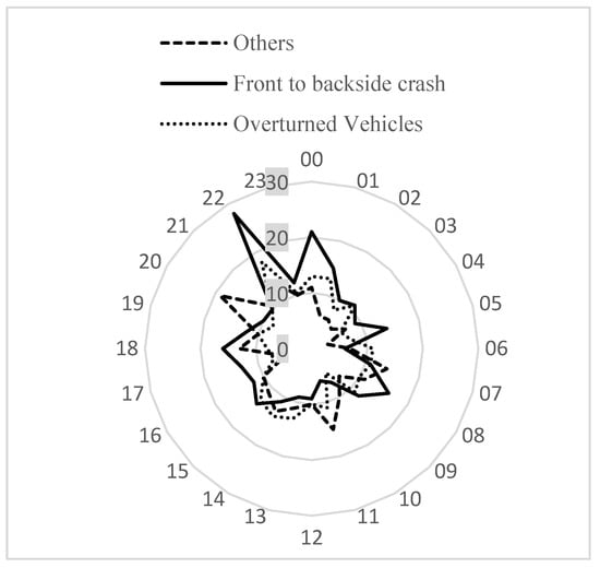 Given the substantial amount of traffic on the Tehran–Qazvin highway and the occurrence of accidents at various times, it is feasible to investigate the correlation between the time of day or night and the type, primary cause, and speed of accidents. Figure 4 provides a visual representation of the average crash type, including front-to-backside crash overturned and rollovers and others considering different hours of the day in which the rear-end crash rate was significantly high.