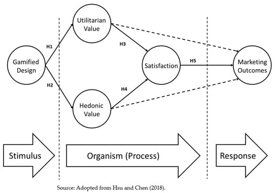 Palmer et al., (2012) [43] proposed four key gamification elements—progress path, feedback and reward, social connection, and user experience—using principles from game mechanics, behavioral economics, and user experience design thinking. However, gamification may not be enough to motivate consumers unless it creates perceived value. Hence, gamified mobile apps must generate perceived value (i.e., utilitarian, or hedonic), to effectively encourage consumer participation and engagement. The literature provides evidence that gamification is effective in creating various perceived values, such as emotional, enjoyment, excitement, economic (reward), and playfulness [44]. While consumer behavior literature provides a variety of different perceived values, previous studies have generally grouped consumer needs into two broad categories: hedonic and utilitarian [45,46]. According to Hirschman and Holbrook (1982) [47], hedonic needs are related to consumption experiences and linked to the desire for pleasure, fun, and excitement. Utilitarian needs, on the other hand, are associated with functional and rational benefits that can be cognitively evaluated [48]. Therefore, perceived utilitarian value is related to the utilitarian aspect of consumer behavior, while perceived hedonic value is related to the hedonic aspects of consumption behavior [49]. Accordingly, we hypothesize that gamified mobile apps will positively influence consumers’ perceived utilitarian and hedonic values.