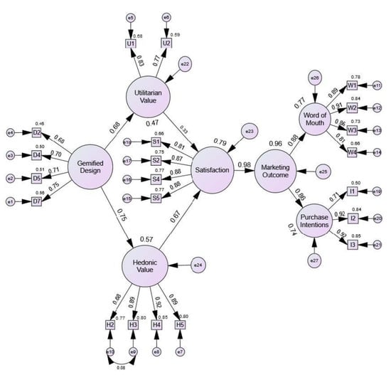 We then used a structural equation model to estimate the relationship among the six constructs (gamified design, utilitarian value, hedonic value, satisfaction, and desired marketing outcomes (WOM and purchase intentions). Structural equation model results are shown in Figure 2, which displays standardized coefficients for the linkages and the r-square values for the model.