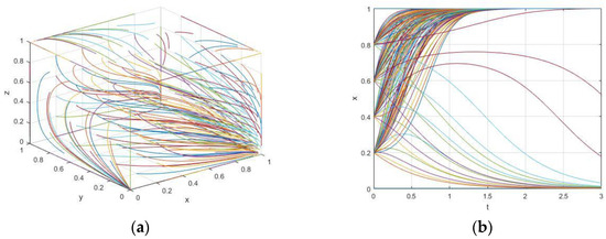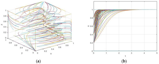 In the absence of a zero-waste city’s construction, the equilibrium point is (0,0,0) when Ng − Me − Mp − Cg + Qe + Qp + Rg < 0 should be satisfied, and this point is the stable point of the evolutionary game. In order to satisfy the assumption basis, the assignment is made according to the actual situation. Let Rg = 3, Cg = 2, Se = 6, Qe = 2, Me = 4, K = 3, Qp = 1, Re = 6, Ce = 5, Rp = 7, Cp = 6, Mp = 5, Ng = 2, Np = 7, Rt = 5, Sp = 3, and I = 2. The parameter simulation plots are shown in Figure 1. As time passes, the government, enterprises, and the public tend to participate negatively. The main reason for this is that the expected benefits to the three parties are low; in this case, the overall cost of the three parties’ expenditures is larger, and the public and enterprises fail to obtain satisfactory subsidies when they participate.