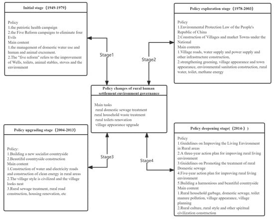 First, in the initial stage (1949–1977), which was before the reform and opening up, the country focused on industrial development and urban construction, holding the development concept of “pollution first, treatment later”, and sacrificing the rural ecological environment for urban industrial development []. In 1952, a nationwide patriotic sanitation campaign was launched, covering mass sanitation campaigns such as the “two management, five changes” campaign and the elimination of four pests []. In the rural areas, the “two management” and “five changes” campaign were carried out. Two management refers to the management of water for living and the management of human and animal excrement, while five changes are the specific operations of two management, including “five changes”, which are improving wells, toilets, stables, stoves, and the environment. During this period, the patriotic sanitation campaign was carried out to reduce the problem of “dirty” in the rural living environment, which led to the health of the public.
