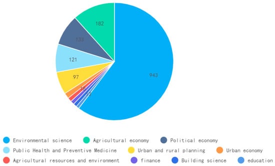 The disciplinary distribution of rural living environmental remediation research has a wide range of fields and involves a multidisciplinary cross-fertilization development dynamic. Figure 4 summarizes the distribution of the primary disciplines involved in the rural living environment and environment governance research literature, with environmental science (58%) and the field of agricultural economics (11%) as the primary research disciplines, followed by public health and preventive medicine (8%), urban and rural planning (7%), urban economics (6%), and agricultural resources and environment (1%). It was found that the relevant contents of rural living environment and environmental governance research are interdisciplinary, and the research contents and research methods of a single literature often involve multiple disciplines. Thus, the complex disciplinary attributes of the rural living environment and environmental governance research field are very obvious.