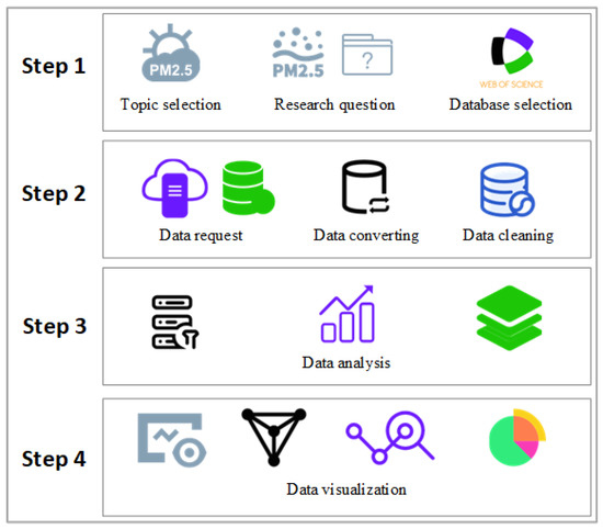 A classic bibliometric analysis process consists of five steps: study design, data collection, data pre-processing, analysis, visualization, and the interpretation of results [31]. The complete analysis workflow is shown in Figure 1 below. For the study design step, we selected PM2.5 exposure as our research keyword for literature searching, and then we defined three scientific questions. The WOSCC, which includes the SCI expanded database and the SSCI, was chosen as the database. Second, during the data collection phase, we ended up with 16,471 papers. These publication data include attributes such as the year of publication, the authors’ countries/territories, affiliation, abstract, keywords, WOS automatically generated keywords, journal source, research area, co-cited literature, etc. Next, we categorized the literature with the help of KNIME and Python, and open-source extensions. In the fourth stage, we used the KNIME platform’s bar charts, network analysis, and bubble charts to create a statistical visualization of the various attributes.