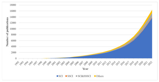 To provide quantitative insights into the temporal trends of PM2.5-related research across different disciplines, we classified the 16,471 published articles into four groups: Science Citation Index (SCI) [33], SSCI (Social Science Citation Index) [34], SCI&SSCI, and Others. The category “Others” refer to the literature published as a conference paper, a book chapter, or in a journal that is not included in the SCI or SSCI databases. Overall, the number of publications in all four categories has been increasing over the past three decades, with the largest number of publications (13,649) in SCI journals, followed by a total of 1732 papers published in SCI and SSCI journals, 1235 papers published in SSCI, and 1073 papers in the “Others” category. To better analyze the temporal trends in the publications on PM2.5 exposure, we divided the study period (1992–2022) into three stages. The first stage, which spans from 1992 to 2002, marks the initial phase of PM2.5 exposure research, during which 248 articles were published. During this phase, with rapid industrialization at the global scale, people began to realize the association between air quality and certain diseases [35,36]. Research on PM2.5 was explored as an emerging area of research at this stage. Between 2003 and 2012, which marks the second stage, there is a significant increase in the number of published articles, with a total of 2128 articles. This surge in publications can be attributed to globalization [37,38] and the consequent dramatic urbanization experienced by many emerging economies, which led to the emergence of a high prevalence of respiratory diseases [39,40]. Take China as an example, there has been a significant increase in cases of atherosclerosis, congenital malformations, and childhood respiratory diseases during this period [41,42]. This trend has garnered global attention, leading to the formulation of Sustainable Development Goals (SDGs) with a specific target (11.6.2) for controlling PM2.5, which were first proposed by governments worldwide during the Rio+20 UN Conference in June 2012 [43,44]. In response, countries began to enact a series of policies to promote greener, more sustainable development after 2012 [45,46]. This worldwide mobilization has further fueled academic interest in air pollutants such as PM2.5. As a result, from 2013 to 2022, there was an exponential growth in scientific research related to PM2.5 exposure, with a total of 14,055 research articles published on this subject.