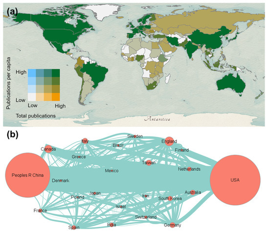 Contribution of countries/territories from 1992 to 2022. (a) Geographical distribution of total and per capita publications between countries/territories map; (b) global academic cooperation network map.
