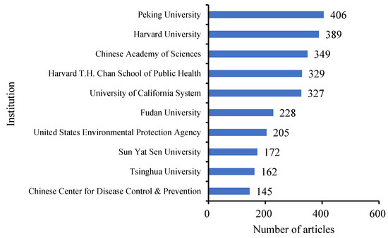 Building on the analysis of the contributions of countries and institutions, we further identified the top 10 institutions in terms of the number of published papers on PM2.5 exposure (as shown in Figure 4). The results indicate a wide participation of universities and research institutions worldwide in the study of PM2.5 exposure. Among them, Peking University, Harvard University, and the Chinese Academy of Sciences stand out as key institutions in this field, with a total of 406, 389, and 349 publications, respectively.