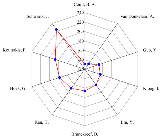 In this section, we calculated the top 10 authors in terms of the number of publications on PM2.5 exposure to reflect their contributions to the field (as shown in Figure 5). The results indicate that each of these authors has engaged in at least 131 publications and made significant contributions to the scientific research on PM2.5 exposure. Most of these authors are affiliated with universities or research institutions in the USA, China, the Netherlands, and Australia. Among them, Schwartz from Harvard School of Public Health stands out as the most active scholar in this field, having published about 224 articles, primarily focusing on air pollution and public health research.