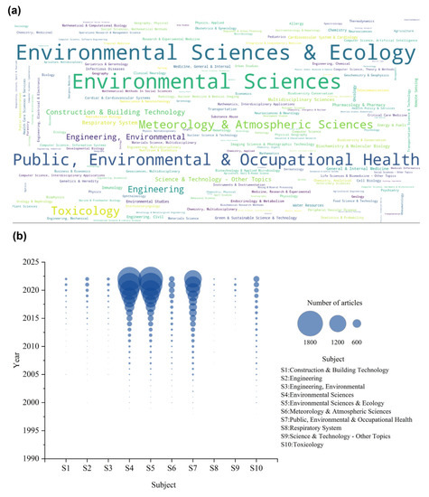 The subjects engaged in PM2.5 exposure research in the past 30 years (Figure 6a) show that the research on PM2.5 exposure spans multiple subjects and is a research hotspot with interdisciplinary properties. As shown in Figure 6b, the top 10 research fields of published literature are Construction and Building Technology, Engineering, Engineering, Environmental, Environmental Sciences, Environmental Sciences and Ecology, Meteorology and Atmospheric Sciences, Public, Environmental and Occupational Health, Respiratory System, Science and Technology—Other Topics, and Toxicology.