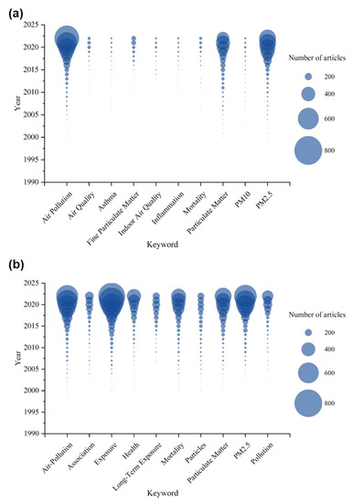 Then, we analyzed the changes in the research hotspots of PM2.5 exposure in the past 30 years and the results are shown in Figure 7b. The keywords that scholars pay more attention to are exposure, air pollution, PM2.5, particulate matter, mortality, health, pollution, particles, association, and long-term exposure, and the number of published articles is more than 1000. During the first stage (1992–2002), exposure to PM2.5 air pollution seriously affected the life and health of residents and aggravated the occurrence of respiratory diseases. Therefore, the keywords that scholars pay more attention to are air pollution, exposure, mortality, and particles, etc. at this stage, and the total number of published articles is 278. During the second stage (2003–2012), the research related to PM2.5 exposure grew rapidly. Exposure, air pollution, mortality, and PM2.5 are the research hotspots, and the numbers of published articles are 557, 511, 425, and 400, respectively. During the third stage (2013–2022), pollution, air pollution, and health are the research background, and the number of articles reached 5037. PM2.5, particulate matter, and particles are the research objects, and the number of articles reached 7153. Exposure and long-term exposure emphasized the state of research, and the number of articles reached 5478. Moreover, air pollution can cause mortality. The association of mortality with PM2.5 exposure is also a research hotspot.