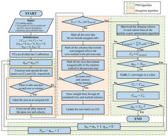 In Figure 2, the PSO algorithm and Hungarian algorithm are marked using the dashed boxes. The PSO algorithm is represented by a green dashed box, while the Hungarian algorithm is delineated by an orange dashed box. In the Hungarian algorithm box, the calculation procedures are performed for the optimization of EVs’ assignment scheme. Equations (21) and (22) ensure there are zero elements existing in each row and column. If there is only one zero in each row or column, the zeros will be named assigned cells and the assignment scheme will be constructed. Otherwise, some calculation procedures are performed to reach the condition.
