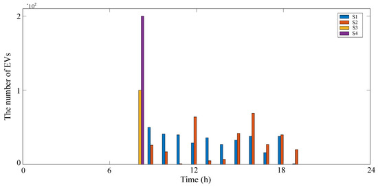 In Figure 3, the different colors of the bars represent the number of EVs under different scenarios. In S1, the number of EVs is random and the variation laws correspond to the electricity price as shown in (24). Based on S1, the number value is changed from NS1 to NS2, and the scenario is named S2. S3 and S4 are utilized to research the influence of EV numbers on the proposed method. So, the number in S3 and S4 is an obvious difference and in the same period. Considering EV users’ usage habits, the EV parking time in G2V and B2V stations is set to be 2 h. The object SOC value is considered as the expected SOC value that meets users’ driving requirements and is equal to the maximum SOC value.