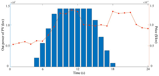 In Figure 4, the blue bars represent the PV generation and the red line segments indicate the electricity prices of the power grid. It illustrates the electricity price change as well as the photovoltaic generation. The PV generation and the electricity price are floating [10,11,12,13,14]. The real-time electricity price is considered, and the PV generation is assumed to be forecasted accurately. It illustrates the electricity price varies as well as PV generation. The fluctuation in electricity price will affect the power cost of EV charging. The PV generation change will be consumed by charging EVs and influence M2 and M4.