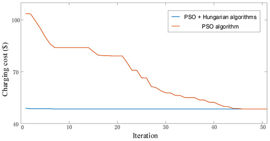 To verify the advantage of the combination algorithm applied in this paper, a comparison between the PSO algorithm and the combination algorithm is presented in Figure 5. In the PSO algorithm, the number of iterations is set to 50, and the number of particles is set to 100. In Figure 5, the convergence speed of the combination algorithm is significantly faster than that of the PSO algorithm. This is because the optimized EVs’ dispatching scheme at each particle is obtained through Hungarian algorithm rearrangement. Therefore, the PSO algorithm’s convergence speed is improved.