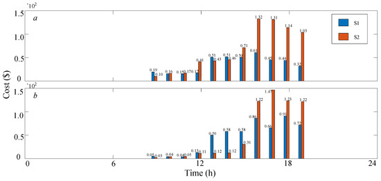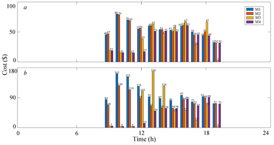 In Figure 9, the cost of M4 with S1 and S2 changes in each period according to EV number and swappable battery reserve. When the battery reserve is sufficient, the cost of M4 changes slightly such as from the 9th–12th hours in S1 and the 9th–15th hours in S2.