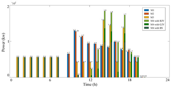 In Figure 6, different colored bars are used to represent the costs associated with different methods. The BDC of M1 and M2 are subequal. This is because B2V mode derives from G2V mode and the charging scheme of the two modes is almost equal. The power cost of G2V mode is dependent on the electricity price of the power grid, and that of B2V mode is dependent on the electricity prices of the power grid and PV generation in microgrids. Therefore, the power cost of M2 is less than that of M1 due to the cheap electricity price of PV generation. The BDC of M3 is less than that of M1 and M2 from the 9th–12th hours. This is because the batteries in the BS station charge with a long preparation time and slow charging. EVs have to fast-charge in M1 and M2 due to the limited parking time. From the 13th–16th hours, the BDC of M3 is not too different from that of M1 and M2. This is because there are few batteries with object SOC value, and the batteries in the station fast-charge to meet the users’ driving requirements. Similar to the BDC, the power cost of M3 is less than that of M1 and M2 from the 9th–12th hours because the charging power is concentrated in the period with a low electricity price. From the 12th–14th hours, the power cost of M3 is much more than that of M1 and M2 because of the lower preparation time and fast-charging state in each time interval. From the 9th–11th hours, the BDC and power cost of M4 are equal to those of M3. In the periods, there is only BS mode existing in M4. From the 12th–17th hours, the BDC and power cost of M4 are less than those of M3 due to several modes of coordination. During the 18th hour and 19th hour, the BDC and power costs are more than those of M3 due to the different charging schemes in before periods.