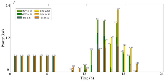 In Figure 10, green and yellow bars are used to represent S1 and S2. In Figure 10, from the 1st–7th hours, batteries in the BS station charge from the power grid due to the low electricity price. The low charging power in each period aims to reduce the BDC. When there are enough swappable batteries, EVs are dispatched to the BS station, such as in the 10th hour and 11th hour. Otherwise, EVs are dispatched to other charging stations, such as the periods after the 12th hour.