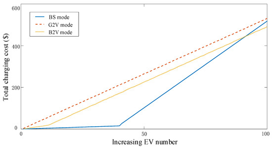 To further analyze the BS mode, the total charging cost comparison among modes is performed in Figure 11. The charging cost of modes changes with the increasing EV number at the 9th hour in S3. In Figure 11, the cost of G2V mode increases linearly. The cost of B2V mode increases slowly, and the growth rate of B2V mode is equal to that of G2V mode when the EV number reaches a certain value. This is because PV generation is considered in the microgrids and consumed locally by the charging load. Then, the PV generation is consumed completely, and EVs in the B2V station charge from the power grid. The charging cost of BS mode increased slowly due to the sufficient swappable batteries and increased remarkably due to the swappable battery shortage. When the number of EVs is more than the BS station threshold, the batteries in the station have to fast-charge and an exorbitant cost is generated. It can be concluded that the cost of BS charging is cost-effective when the battery reserve is abundant.