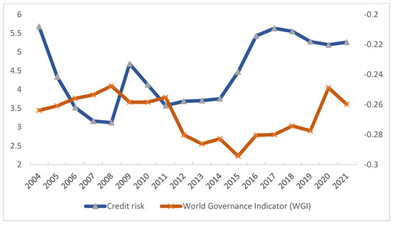 Moreover, based on the World Bank DataBank (2004–2021), the governance in the BRICS countries was relatively weak and the average score was −0.264 (out of 2.00). In a weak governance environment, the judicial system is not strengthened; the commitment to the rule of law, regulatory quality, and government effectiveness are relatively lower; and the corruption level is comparatively higher. The relatively weak governance settings in the BRICS countries lead to the banking sector being likely to feature excessively risky decisions made by executives at the expense of depositors. This mostly drives the credit quality to become lower and CR to increase in such settings. Studies by [25,29] underscored that corruption significantly exacerbates banks’ CR. Likewise, the works by [32,33,34,35] showed that rising government instability, lack of commitment to the rule of law, and high corruption are significant drivers for the increase in CR. Ref. [36] also revealed that weak judicial empowerment and low bureaucracy quality contribute to rising CR. Moreover, ref. [37] documented that CR can be decreased by enhancing the quality of bureaucracy, strengthening the judicial system, and improving legal enforcement. Furthermore, ref. [33] suggested that a strong commitment by the government to the rule of law leads to decreasing banks’ CR.