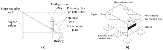 In this paper, the design model box was assembled by supporting columns, a bearing, a soil retaining plate on both sides, a slope toe soil retaining plate and two slope soil retaining plates. The assembled model box was not closed on the top and one side, and the box bottom was a designed inclination angle (30° or 45°; two optional inclination angles). The appearance size of the model box was 680 mm × 400 mm × 500 mm, and the similarity ratio was 1:100. The model box was made of 3 mm thick iron material. The assembled model box profile (Figure 1a) and the installation diagram (Figure 1b) are as follows: