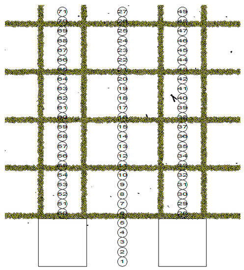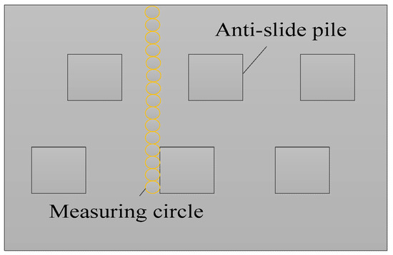 Based on a PFC2D program, this section carries out numerical simulation research on three common pile layout forms; namely parallel pile layout, plum blossom type and partially interval pile layout, designed based on these two pile layout methods. Since the safety and convenience of construction are not guaranteed when the pile diameter is less than 2 times, a connecting beam should be installed when the spacing is greater than 6 times the pile diameter. Therefore, the spacing between the front and rear rows of piles should be 2–6 times the pile diameter [28,29,30,31]. The size of the rectangular section anti-slide pile set in this section is 1 m × 1 m, the row spacing and column spacing are 2.5 times the pile diameter. The numerical calculation model of partially spaced pile is shown in Figure 15, and the circle in the figure is the measurement circle.