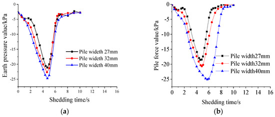 (a) Different pile width of soil pressure numerical change curve. (b) Different pile width of pile body curve variation in the earth pressure numerical value.