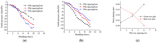 In this section, three kinds of clear pile spacing are designed, which are 2 cm, 4 cm and 6 cm, respectively. The aggregate is mixed dry subgrade soil and Fujian Pingtan sand. The landslide adopts a 45° inclination angle, the fill height is 35 cm, and the section width of anti-slide pile is 40 mm. The anti-slide pile is set by plum blossom pile arrangement, and the dead load is applied at the top of the aggregate. The variation curve of earth pressure with shedding time is shown in Figure 9a,b.