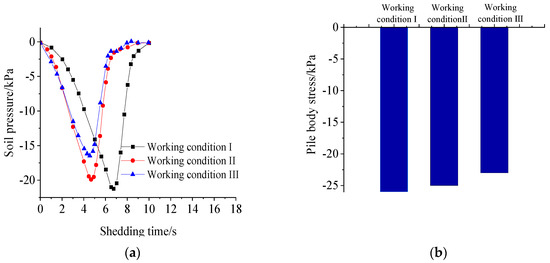 Figure 12b is a numerical histogram of the maximum stress value of the pile body under three working conditions. The maximum soil pressure of pile body under condition 1 is, respectively, 10.5% and 19.7% higher than that under condition 2 and condition 3. It can be found that the stress condition of the pile body is consistent with the law of earth pressure between piles, which is dominated by cohesion and decreases with the decrease in cohesion. This shows that with the increase in soil cohesion, the soil arching effect is enhanced, and the thrust of the load transmitted to the anti-slide pile through the soil arching is increased, which can give full play to the anti-slide ability of the anti-slide pile. This shows that with the increase in soil cohesion, the soil arching effect is enhanced, and the thrust of the load transmitted to the anti-slide pile through the soil arching is increased, which can give full play to the anti-slide ability of the anti-slide pile.