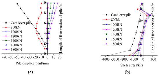 It can be seen from the Figure that the displacement of the cantilever pile basically increases linearly from bottom to top. The maximum displacement occurs at the pile top, and the displacement exceeds 50 mm, and, at this time, the maximum displacement of the slope body is 152 mm. Although the existing specification for the cantilever pile top horizontal displacement limit value is not clearly defined, excessive displacement will obviously put forward higher requirements on the bending strength of the anti-slide pile, so as to increase the pile cross-sectional area of the anti-slide pile and reinforcement ratio. With the application of anchor cable tension, the force on the pile body tends to be reasonable, and the displacement of the pile body decreases significantly. Compared with the application of 800 kN anchor cable tension, the maximum horizontal displacement of the original cantilever pile body reduced by about 64%. It is worth mentioning that when the prestress increases to 1200 kN, the pile body has a reverse displacement in the direction of the sliding body. This phenomenon reflects the fundamental difference between the prestressed anchor cable anti-slide pile and the cantilever anti-slide pile in the force characteristics. It also shows that the application of prestressed anchor cable is more beneficial to slope stability. A similar conclusion can be obtained from the curve of the shear stress of the free section of the pile body with the prestress of the anchor cable shown in Figure 13b.