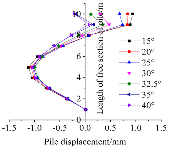 It can be seen from Figure 14 that with the increase in anchor cable inclination, the displacement in the middle of the free section of the pile body decreases first and then increases. When the anchor cable inclination is 32.5°, the displacement of the pile body is the smallest. However, if the inclination angle of the anchor cable is too large, the embedded angle between the pile top and the soil will become smaller, and the pile deformation will occur at the top of the soil-squeezing pile. After that, with the increase in the inclination angle of the anchor cable, the displacement of the pile body to the free surface gradually increases. In addition, when the inclination of the anchor cable increases, the displacement of the pile top to the free surface gradually increases, and the reverse bending phenomenon at the pile top becomes more and more obvious. At the same time, according to Table 7, with the increase in anchor cable inclination, the maximum shear stress and displacement of the pile top at the anchor point decrease first and then increase. When the anchor cable inclination is 32.5°, the maximum shear stress and displacement of the pile top show the minimum value; that is, under this anchor cable inclination, the maximum shear stress at the anchor point of pile body and the displacement at the middle and top of pile body are the minimum values. Therefore, choosing a reasonable anchor cable inclination of prestressed anchor cable has significant engineering application value for reducing the stress and deformation of the combined retaining structure.