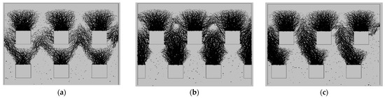 Figure 16d shows the X-direction stress fluctuation range measured by the measuring circle. It can be seen that the thickness of the soil arch under the form of the rectangular pile layout is much smaller than that in the other two forms, indicating that the spatial effect of rectangular pile layout is the worst, and the soil arch effect between the front and rear piles is not strong. The soil arch thickness of the spacing piles is the largest, but the stress level of the soil arch is lower, and the bearing capacity of the soil arch is lower than that of plum blossom piles, which can also be reflected from the contact diagram of soil particles between piles under different pile layout forms in Figure 17a–c. The denser and thicker the black line in the figure indicates that the contact force of soil particles is greater, which also indicates that the compactness of the soil is higher here. It can be seen from the figure that the indirect contact force of soil particles of the plum blossom pile arrangement is the largest, which also shows that the soil arch formed is the most stable. Compared with the soil arch formed by the rear piles in Figure 17a–c, it is found that the soil contact force fails to penetrate when the rectangular and interval piles are arranged, while the contact force can be penetrated when the plum blossom type piles are arranged, which is consistent with the X-direction stress monitored by the measuring circles No. 20~25 measurement circle in Figure 15. In conclusion, the plum blossom pile arrangement can not only increase the stability of the soil arch formed by the front anti-slide piles, but also assist the rear pile to form a stable soil arch.