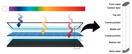 The construction of a multi-junction solar cell involves the fabrication of multiple layers of semiconductor materials with varying band gaps, stacked on top of each other to form a single device, as shown in Figure 2 [21]. The layers are arranged in such a way that the highest energy band gap material is placed at the top, while the lowest band gap material is placed at the bottom [10]. MJ junction solar cells have a higher efficiency compared to single-junction cells. In [22], a five-junction cell achieved efficiency of up to 40%. It is also noted that MJ cells achieved efficiency of 47.1% [23]. Furthermore, a triple-junction cell was used to achieve efficiency of 41% [24]. A triple-junction solar cell (10 × 10 mm2) made of GaInP/GaInAs/Ge material had electrical efficiency of 40–42% and a fill factor of 83–89% [25]. MJ solar cells have also been used in combination with solar concentrators. The solar cell material is reduced through concentration, which ultimately provides a cost-effective and efficient solution. An experiment was conducted in which a four-junction cell achieved efficiency of 46% [26]. A six-junction solar cell was evaluated and achieved efficiency of 50% [27].