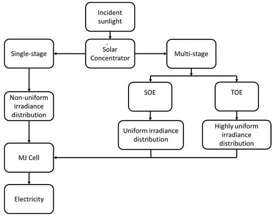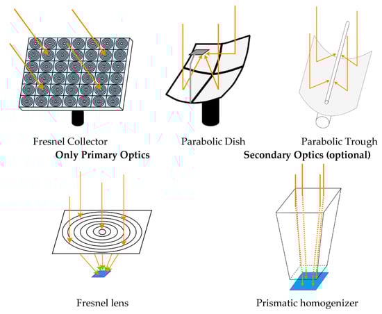 Optical losses occurred due to misalignment between the solar cell and concentrators in both CPV and CSP systems [34,35,36]. The block diagram of solar concentrator systems is shown in Figure 3. In [31], a novel CPV system was developed to achieve better optical efficiency. In this study, the optical parameters that affected the efficiency of the system, such as geometrical concentration, acceptance angle, and optical efficiency, have also been discussed. A wide range of solar concentrators is presented in Figure 4 [37].