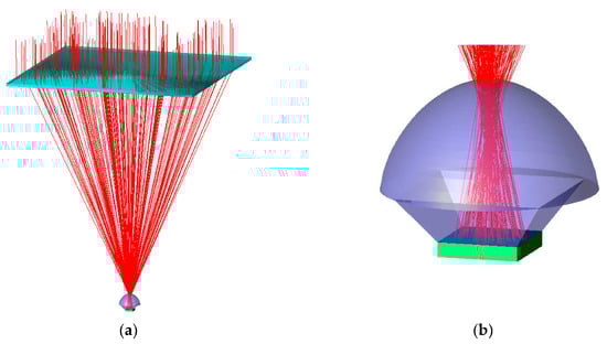 (a) Nonsequential raytracing diagram of an HCPV system with an acceptance angle of 1° and (b) detailed raytracing in the second stage of the system [52].