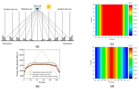 Comparison of the Fresnel reflector and parabolic trough: (a) schematic diagram of the linear Fresnel reflector, (b) simulation results of both systems, (c) irradiance distribution over the solar cell using linear Fresnel reflector, and (d) nonuniform irradiance distribution using parabolic trough concentrator [65].
