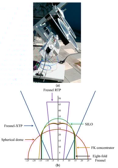 (a) Hardware design using a two-stage solar concentrator [68] and (b) comparison of SOEs (eight-fold, FK, RTP, SILO, spherical dome, and XTP) used for CPV systems [28].