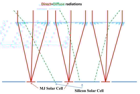 A schematic of hybrid CPV system, harvesting direct and diffused radiations where direct radiations are focused over the MJ solar cells using pyramid (SOE), and diffused radiations are received by Si solar cells [95].