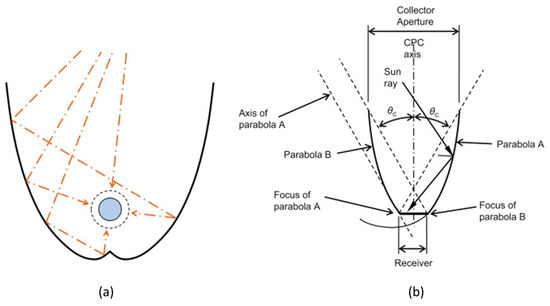 The CPC is a nonimaging solar concentrator consisting of two parabolic curved surfaces [42]. It redirects all of the incident rays toward the receiver, as shown in Figure 10a [116]. A design using two parabolic curves, A and B, was developed to redirect the sunlight toward the flat receiver using the edge ray principle, as shown in Figure 10b [117]. An LCPV system was designed and achieved a geometrical concentration of 3.6× using the CPC [34]. An integrated CPC-based CPV/T system was developed with and without glazed material, where the unglazed CPC achieved better results [118]. The CPC was also used as a secondary concentrator along with the parabolic dish concentrator to achieve optical efficiency of 68% [119]. In [107], a concentrating system using the CPC achieved a geometrical concentration of 285×, optical efficiency of 72%, and an acceptance angle of ±1.1°. A novel CPV system for an electric vehicle was tested to be considered for different optical parameters [61]. The system achieved a geometrical concentration of 4×, optical efficiency of 80%, and electrical efficiency of 35%. Si-based PV cells were also used to retrieve energy from the light. A detailed comparison of CPC-based systems is presented in Table 3, which shows that a wider acceptance angle of ±44.7° was achieved in comparison with other solar concentrators. Furthermore, Table 3 depicts that the CPC has a low geometrical concentration while managing to achieve optical efficiency of 80%.