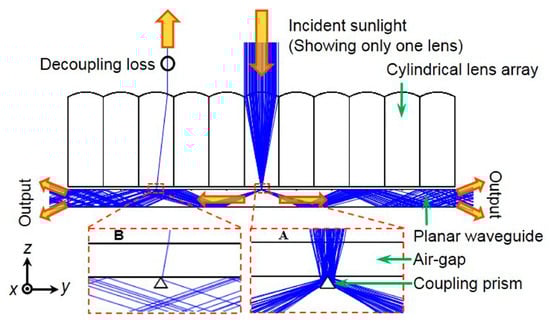 - Xie, P.; Lin, H.; Liu, Y.; Li, B. Total internal reflection-based planar waveguide solar concentrator with symmetric air prisms as couplers. Opt. Express 2014, 22, A1389–A1398. [Google Scholar] [CrossRef]