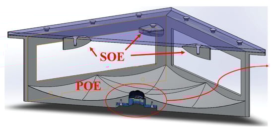 Micro-level CPV systems are used for small-scale applications to generate electricity. These concentrators need to be designed to overcome optical and manufacturing complexity and optical losses due to misalignment. Small-scale concentrators are designed using lenses instead of traditional metallic reflectors [125]. A light waveguide is used with the micro-concentrators by optimizing different parameters. Furthermore, geometrical concentration, total optical concentration factor, and acceptance angle are provided for rectangular and tapered systems, where the rectangular design has a geometrical concentration of 100× and an acceptance angle of ±15°, while the tapered design has a geometrical concentration of 237× and an acceptance angle of ±9°. It can be noticed that the optical concentration increases at the expense of the acceptance angle. A single-stage CPV system [135] achieves a geometrical concentration of 1000× and optical efficiency of 81%. In [136], a two-stage micro-CPV system was designed using a plano-convex lens as a primary concentrator, which achieved a geometrical concentration up to 500× with an acceptance angle of ±1.76°. A three-stage ultra-high CPV system was designed to achieve a geometrical concentration of 938×, as shown in Figure 14 [75]. This ultra-high CPV system was tested for hardware and software simulations and achieved an acceptance angle of ±0.30° and ±0.41°, respectively. Table 6 illustrates different CPV design configurations and optical performance parameters for small concentrators. It shows that a geometrical concentration of <1000× was achieved. Furthermore, Table 6 depicts that an acceptance angle of ±15° and optical efficiency of up to 84% were achieved.