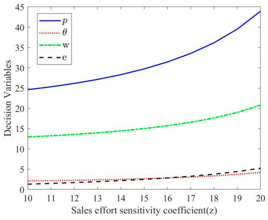 When considering the retailers’ sales efforts under centralized decision making, when , the profit function is the joint concave function of the retail price, unit CER, sales effort level, and all have optimal values. The optimal retail price, maximum unit CER, and optimal sales effort are , , , and the maximum profit of the L-CSC is . More details are shown in Appendix A.