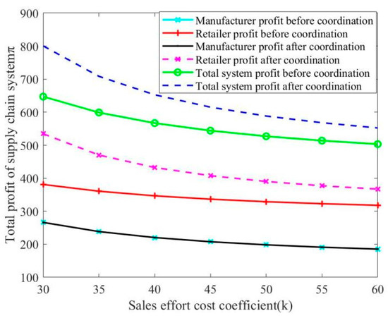 Increasing the low-carbon preference and sales effort coefficients makes manufacturers and retailers more profitable. This is because the higher the consumer’s preference for LCP, the more willing they are to buy green LCP at a higher price, leading to the expansion of market demand for them. The L-CSC will develop a high-price strategy to increase profits by increasing market prices. With the increase in consumers’ low-carbon preference coefficient, manufacturers and retailers will increase CER input and sales effort level to meet consumers’ purchase demand, and the CER and sales volume of products will also increase accordingly. As the cost increases due to increased inputs, retailers will increase the retail price so that both parties can profit more. When the sensitivity coefficient of sales effort increases, retailers will make more sales efforts to improve their market share. Meanwhile, manufacturers will also employ this effect to increase the CER of products to establish a low-carbon image of energy conservation and emission reduction.