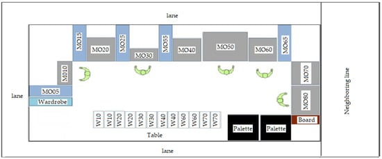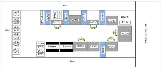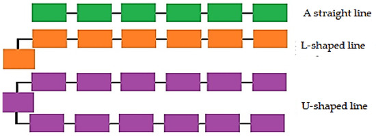 The conversion of machines takes place on production lines. The production line is a set of machines and stations arranged in accordance with the sequence of operations performed in the technological process. The number of stations depends on the needs and the manufactured details or assemblies [33,34]. The product passes through the workstations in the so-called production process. The concept of line production is characterized by the fact that machines are arranged to form lines [35]. Its arrangement is characterized by the fact that the product passes through successive, adjacent production stations arranged in a characteristic way [36,37]. An exemplary arrangement of stations on production lines is shown in Figure 2. Production on the line can be partially or fully automated. When designing the line, the SMED methodology should be taken into account, which contributes to shortening the changeover time of machines and devices and increasing the efficiency of the line.