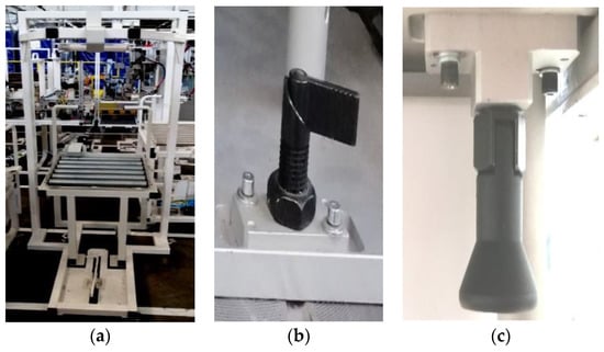 Modified cart with latches for converting the lower and upper tools: (a) trolley for changing the lower and upper tools, (b) lower tool latch, (c) upper tool latch. Source: own study.