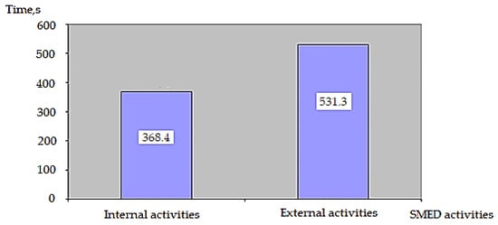 There were five feeders with components on the line: MO05, MO15, MO25, MO35 and MO65, which were fed by line feeders. The line feeder completed the missing components and replaced them with the new components of the new product reference. Five operators operated manual assembly stations, automatic stations, robotic cells (gluing cells), and automatic and visual control stations. Their duties also included the control and packaging of finished products and the retooling of machines. After the observations, it was found that the production of lamps was in accordance with the standards. We were dealing with a smooth flow of one piece (one-piece flow), and the manufactured lamps left the production line in rhythmic, recurring intervals. The work on the tested line was balanced, which meant that the time of the operators’ work sequence was equal. The line worked in a takt of 42 s. The analysis of the changeover cycle for the initial state took into account all the activities of the operators in the specified period during their duration. Internal retooling included the activities that must have been performed when the machine or device being retooled was switched off. On the other hand, external changeovers were all those activities that could be performed before stopping the machine or after restarting the process converted to the production of a new type of product. Such a division had far-reaching consequences because it was internal changeovers that caused losses in machine operation efficiency and downtime, which resulted in extending production series. It was from the internal changeovers that the analyses and the process of shortening the changeovers most often began. Knowing the times of individual stages, one could start looking for system modernization. The times were measured between the individual stages of the process, and it was on their bases that remedial actions were taken to modernize the production processes. According to the SMED methodology, activities were divided into internal and external. The total time of all operator activities was 899.7 s. During this time, internal activities were performed in 368.4 s and external activities in 531.3 s (Figure 7). In total, 157 activities were performed, including 61 internal and 96 external related to the changeover process (Figure 8).