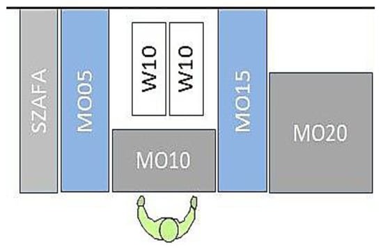 In order to shorten the path traveled by the operators during the changeover, a new innovative layout of the production line was designed by the authors, shown in Figure 4. The storage place for tools was marked and located in a way that facilitated the removal of trolleys by operators, without disturbing or getting in each other’s way. When designating new tool storage areas, sections for trolleys for individual workstations were precisely marked. Trolleys for conversion were clearly and comprehensibly marked. The design of the automatic station trolleys changed. The previous four carts, two for the lower tools and two for the upper tools (Figure 5), were replaced by two merged carts (Figure 6). They could operate the lower and upper stations simultaneously. Replacement of handcarts was one of the stages of modernization of the production line. The trolleys were changed to those that had comprehensive and fully automated tools and assembly accessories adapted to the production cells. The trolleys were fully automated and of standardized dimensions that fit into modern internal transport devices as part of tool management. Trolleys for conversion to lower and upper tools were adapted to the dimensions of workstations, the functionalities of which allowed for convenient and safe changeovers.