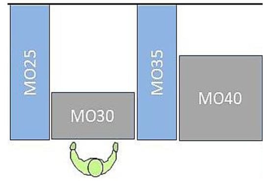 Operator 1 worked at stations MO10 and MO20. The sequence of operator 1’s activities included the manual assembly of lamp components at the MO10 station and then the transfer of the semi-finished product to the M020 station, where the automatic assembly process took place (Figure 10).
