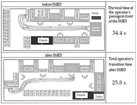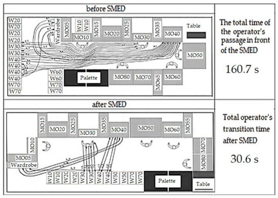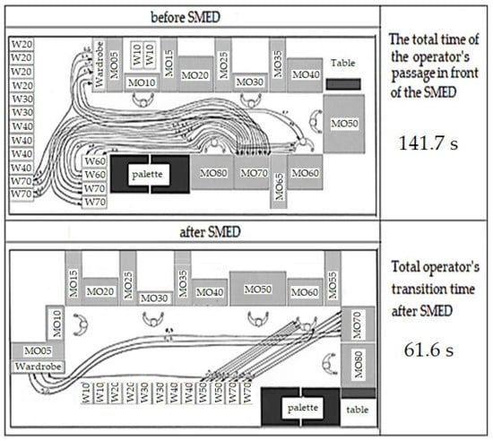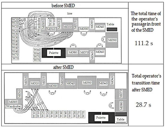 - In the original concept of organizing the changeover on the line, its time using the SMED methodology was shortened to 198.3 s. This new changeover lasted 291.4 s shorter. The time used should have been spent on production for a line operating with a takt of 42 s; this was enough time to produce six full lamps. Implementation of corrective actions resulted in a reduction in the total time used by operators for changeover from 899.4 s to 473.4 s. The time of performing internal activities during changeover was significantly reduced, which was 368.4 s before and 248.9 s after the transformation. Furthermore, the times of external activities were from 531.3 s to 224.5 s. Additional benefits resulting from the introduction of the SMED method included the reduction in the number of external and internal activities. The number of internal activities was reduced from 61 to 43 and external activities from 96 to 63.