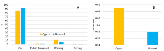 Modal share (A) and car ownership (B) in Cyprus and Limassol. Sources: [47,65,67].