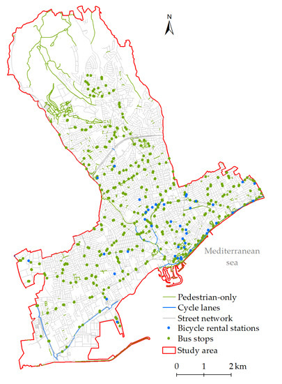 - Proximity to public transportation: measures the walking distance to access bus stops (Cyprus has no rail transport), as well as bicycle rental stations from any origin, such as residential buildings, schools, and shopping. As adopted in other studies, proximity was defined as a linear walking distance of 400 m to bus stops [54,55,56] and 300 m to access bicycle stations [57,58]. Previous studies have shown that, in general, longer distances are correlated with a lower probability of walking to access public transportation [54].